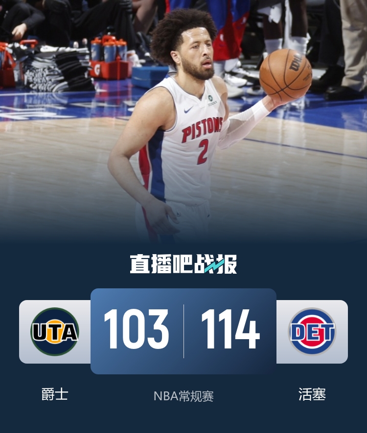 比赛开始后活塞抢占先机,随后米哈伊柳克连中四球单人打出攻势帮助爵士反超比分,活塞依靠内线双塔稳住局面。第二节爵士在马尔卡宁的带领下率先打出攻势取得领先,第二节后半段杜伦在内线爆发帮助活塞缩小分差。易边再战,活塞延续攻势一举完成反超,爵士在进攻端命中率下降,并且失误增多。最后一节爵士上来掀起反扑一度追到3分,但随后他们哑火,康宁汉姆连续拿分帮助活塞将分差拉大到两位数,爵士无力缩小分差,最终活塞114-103击败爵士取得4连胜。