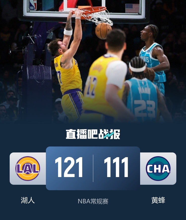 首节之争双方状态都非常出色打出高效进攻,湖人单节轰下36分并在前期取得微弱优势,黄蜂则一路稳定输出轰出40分后程反超;次节双方回归正常两队半场命中率均在50%以上,湖人后场东契奇和里夫斯两人合力砍下38分,黄蜂则依靠布里奇斯拿下20分的表现咬住4分劣势进入下半场。休息归来黄蜂哑火前10分钟里仅得11分,湖人顺势轰出26-11的攻势直接拉开比分,末段黄蜂短暂追至个位数但没能再进一步。最终,湖人客场击败黄蜂收下比赛。